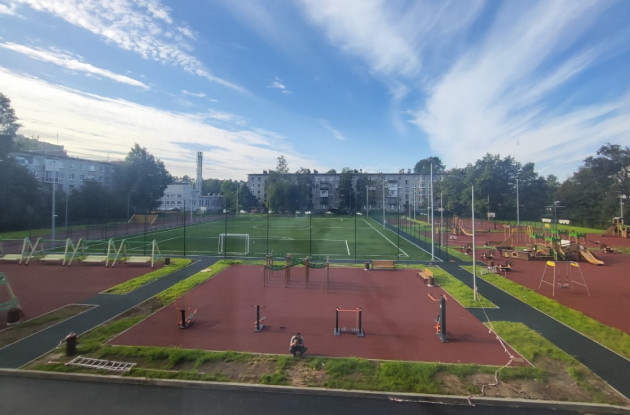 Рядом со школой обустроена спортивно-физкультурная зона, включающая площадки для футбола, волейбола, баскетбола, а также беговые дорожки.