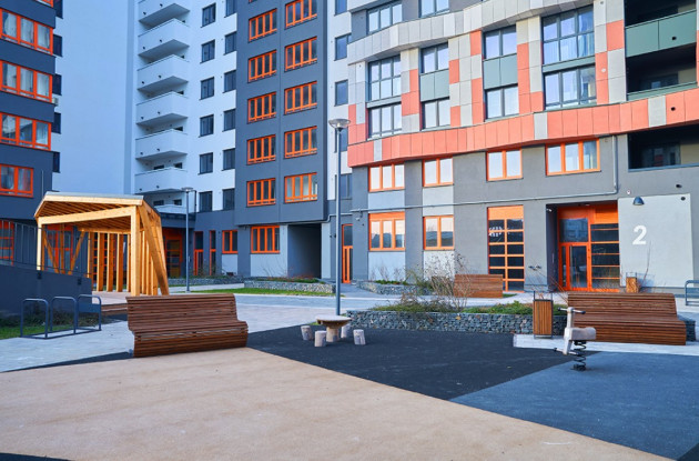 Во дворе ЖК «Альпы» выполнено благоустройство по дизайн-проекту – оборудованы безопасные детские площадки с игровыми комплексами и пешеходный мост с устроенными пространствами для отдыха. Газоны двора оформлены габиоными, передающими атмосферу альпийских предгорий.
