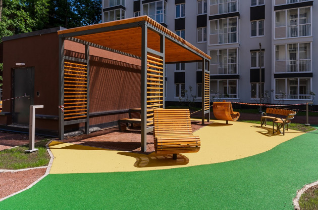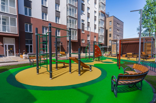 В закрытом охраняемом дворе комплекса предусмотрены зеленые насаждения, оборудованные места для комфортного отдыха жителей, игровые детские площадки с качественным и безопасным оборудованием, стоянки для велосипедов.