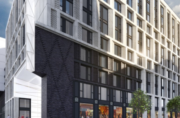 Решение уличных фасадов гостиничного комплекса основано на контрасте крупноформатного светло-бежевого керамогранита под натуральный камень и темно коричневого кирпича. Фасадные элементы из керамогранита и кирпича будут наложены на решетку алюминиевой витражной системы обрамления витрин в первых этажах и оконных проемов номерного фонда цвета мокрого асфальта. В результате получится эффект трехслойного фасада с достаточно высокой детализацией. Акцентные четырехэтажные проемы будут облицованы крупноформатными алюминиевыми панелями.