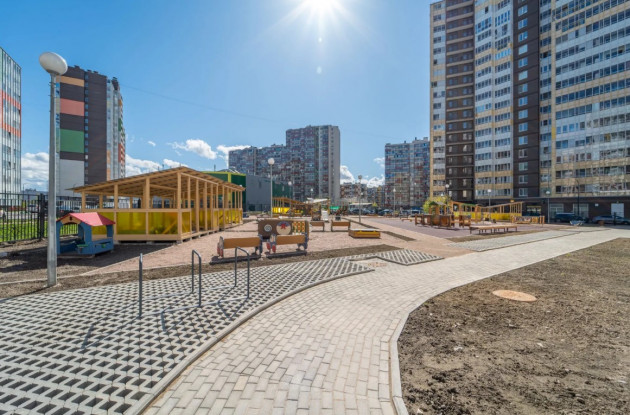 Во дворе благоустроены шесть игровых площадок с навесами, песочницами и качелями, а также большая спортивная площадка для занятий физкультурой.