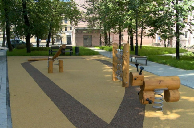 На территории установлены детская площадка, малые архитектурные формы, уличная мебель, а также проведено дополнительное озеленение — высажены кустарники и новые деревья.