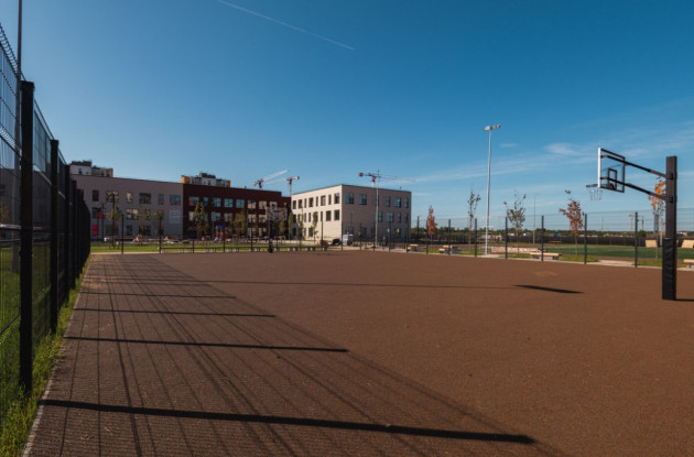 Внутри здания предусмотрены спортивный и тренажерный зал, а на улице — футбольное поле, площадки для волейбола и баскетбола, беговые дорожки и дорожки для прыжков в длину. На территории вокруг школы также появились зелёные зоны для отдыха и игровое пространство.