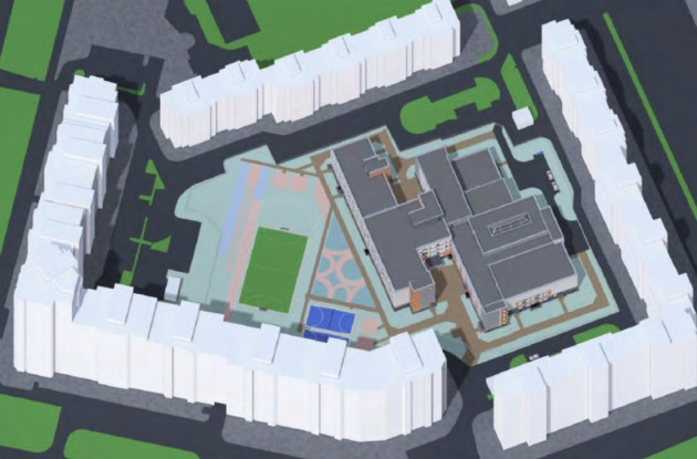 Здание будет переменной высотности (1-4 этажей). На первом этаже планируется разместить вестибюль с гардеробными, классы начальной школы с помещениями продленного дня, а также мастерские, бассейны, столовую и медицинский блок.