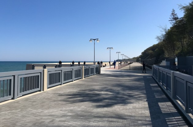 На променаде для удобства отдыхающих уже установлены деревянные скамейки, информационные стенды, велопарковки. Настроено освещение с помощью светодиодных фонарей. Обустроен и обновлены лестничные спуски в прогулочную зону. Финальным аккордом в благоустройстве стало озеленение газонов.