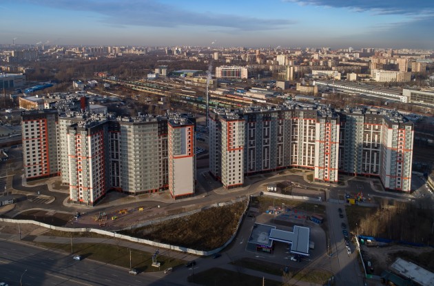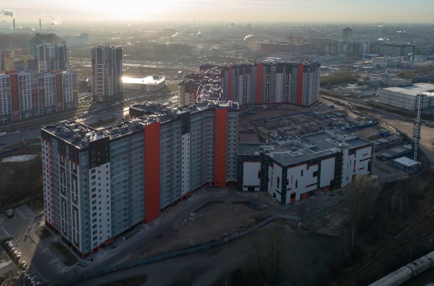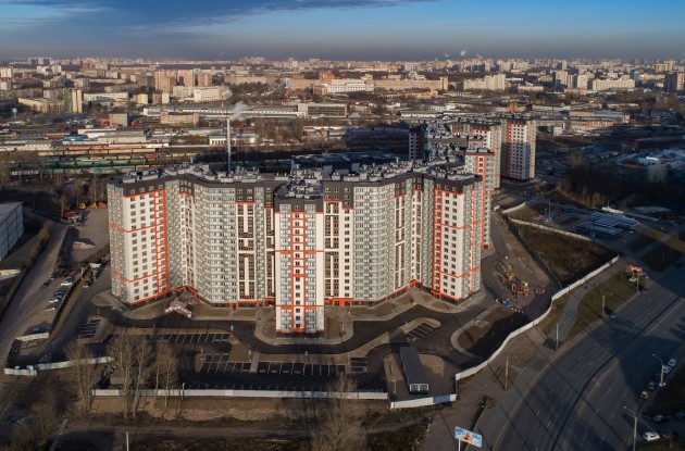 фасада: белого, оранжевого, насыщенно черного. Площадь участка - 41 016 кв.м. Объем - 459 748,1 куб.м., в том числе подземной части - 27 379 куб.м. Количество этажей - 8, 18 шт., количество подземных этажей - 1 шт. Высота - 54,03 м. Количество квартир - 1 455 шт. Площадь встроенных помещений - 4 456,5 кв.м. Площадь помещений врача общей практики - 409,3 кв.м. Площадь гаража - 15 195,5 кв.м. Общая площадь квартир - 76 976,5 кв.м. Количество машино-мест в гараже - 382 шт. Каркас объекта - монолитные железобетонные конструкции. Материал наружных стен - система вентилируемых навесных фасадов и декоративная тонкослойная штукатурка с последующей окраской по кирпичным/газобетонным/бетонным стенам. Материал перекрытий - монолитный железобетон. Класс энергоэффективности - В (высокий).
