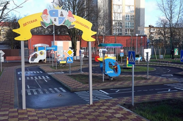 На территории оборудованы 2 спортивные площадки со специальным и травяным покрытием, оснащенные физкультурным оборудованием. Построена детская игровая площадка «Автогородок». Территория детского сада украшена малыми архитектурными формами, озеленена декоративными хвойными культурами, кустарниками и деревьями.